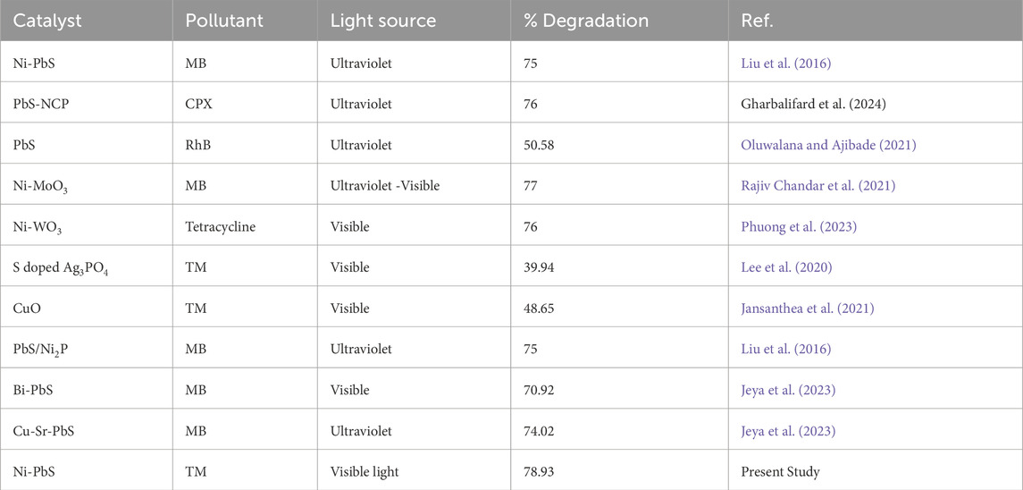 Table 2 shows the comparison of the catalytic activity of synthesized Ni-PbS with other reported catalysts for the removal of pollutants in aqueous solution. It has been seen that very few studies contain the degradation of colourless pollutants using catalysts. In the present study, Ni-PbS shows the maximum degradation of 78.93% in visible light for colourless pollutant, i.e., TMX.