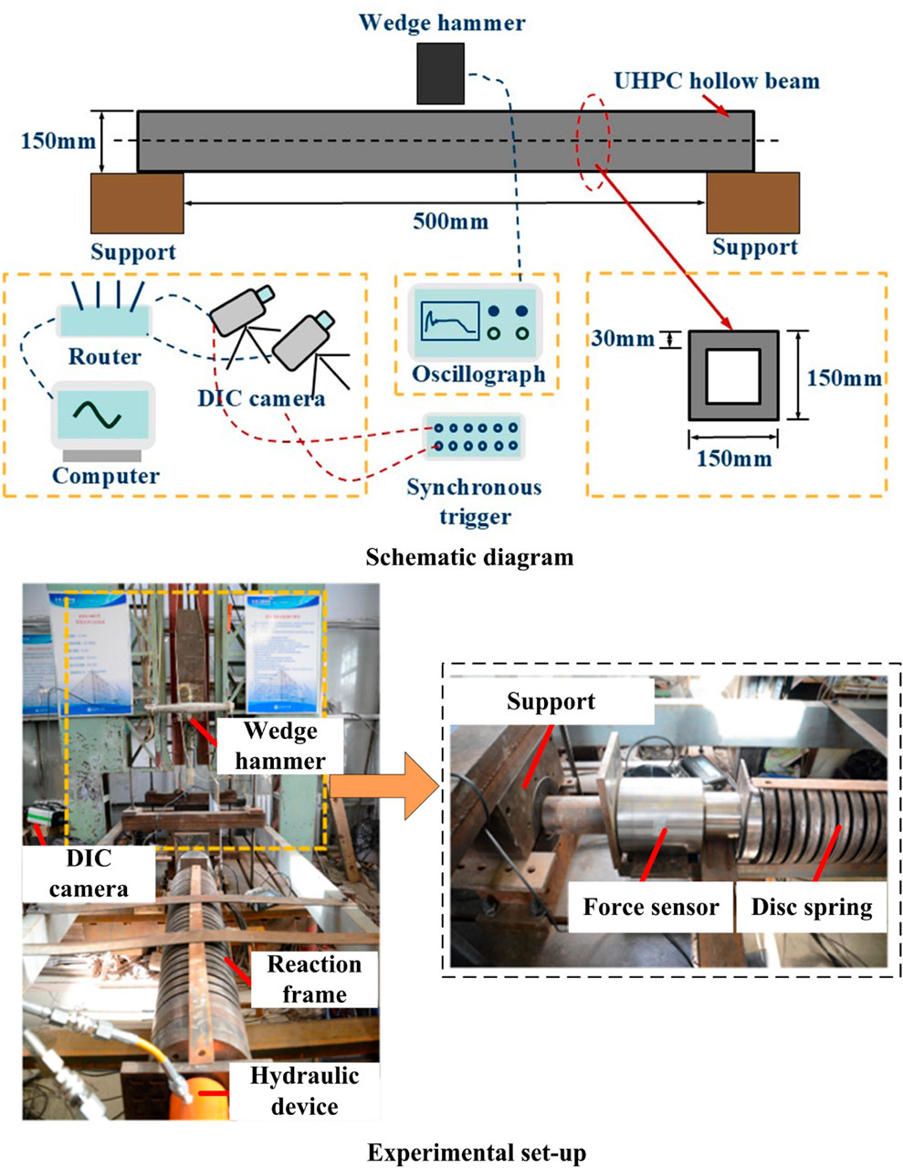 The tests provided insights into the dynamic deformation modes, impact force evolution, and failure mechanisms of UHPC hollow beams under varying impact velocities. When the drop height is 0.1 m, the cracking location of the UHPC hollow beam does not coincide with the loaded area. The primary source of experimental error is attributed to the non-uniform distribution of steel fibers during the preparation of the UHPC hollow beam. The test environment and the precision of the instruments also influence quantitative data such as the recorded load-displacement history. Therefore, further numerical simulation is necessary to better understand the dynamic response of the UHPC hollow beam under impact loading. In addition, the influence of cross-sectional dimensions and wall thickness on impact resistance requires further numerical investigation.