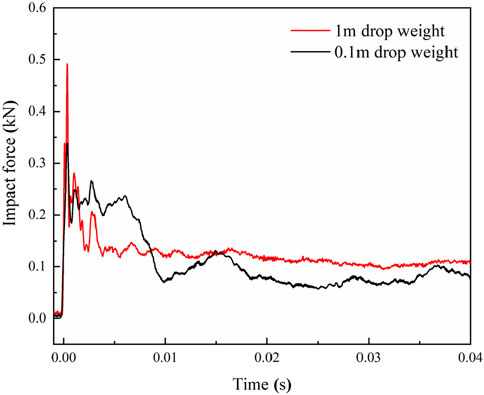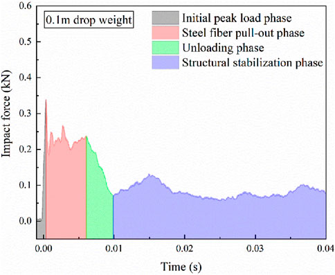 Under the 0.1 m drop height, the peak impact force was 0.34 kN. During the steel fiber pull-out phase, the force oscillated between 0.18 kN and 0.24 kN. Complete unloading occurred at 0.01 s, after which the force stabilized. For the 1.0 m drop height, the peak force increased to 0.49 kN, with oscillations between 0.13 kN and 0.28 kN. Structural failure occurred at 0.004 s, leading to a rapid decline in load-bearing capacity (Figure 2). Notably, higher impact energies shortened the response durations during the pull-out and unloading phases.