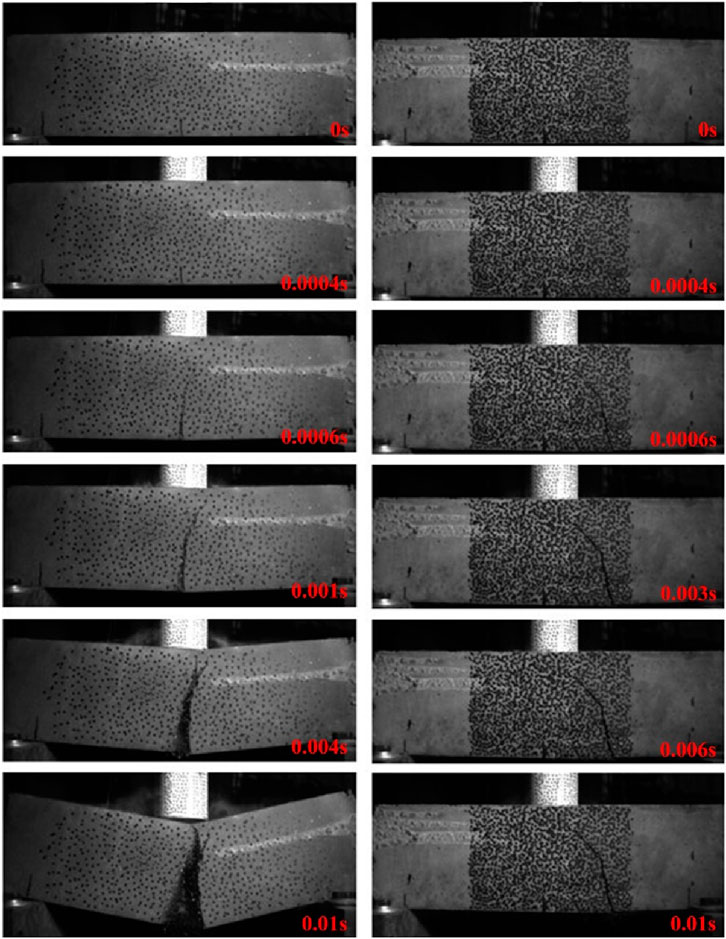 The UHPC hollow beams demonstrated distinct impact resistance characteristics under varying impact energies. The peak impact force increased with impact energy, while higher energy impacts also widened the fluctuation range during the pull-out phase. Compared to the 1.0 m drop height, the peak force at 0.1 m decreased by 26%. DIC images captured at critical time points (Figure 4) revealed the deformation process. 0.1 m impact: Cracks initiated at the bottom and propagated upward, but the specimen retained partial integrity after fiber pull-out. 1.0 m impact: Cracks rapidly extended from the bottom, causing complete fiber debonding and structural collapse at 0.004 s. The random distribution of steel fibers in the UHPC matrix led to non-uniform strain localization. For instance, under the 0.1 m impact, fracture locations deviated from the loading point due to fiber heterogeneity. The dynamic response process of the UHPC hollow beam observed in the experiment is similar to the responses reported by Fan et al. (2019) and Yoo et al. (2015). Under a drop height of 1 m, the UHPC hollow beam exhibited a flexural failure mode, while under a drop height of 0.1 m, it displayed a shear failure mode. The specimen was placed horizontally on the supports and was free to rotate at the boundaries when subjected to impact loading. As a result, no cracking occurred at the boundaries of the UHPC hollow beam under either impact condition. Post-processing of DIC data for the 1.0 m impact case (Figure 5) revealed strain (εxx, εyy) and stress (fxx, fyy) distributions at 0.004 s. The maximum tensile strain and stress occurred along the length direction, decreasing upward. Minor scattered strains in the height direction highlighted the influence of fiber randomness on localized deformation.