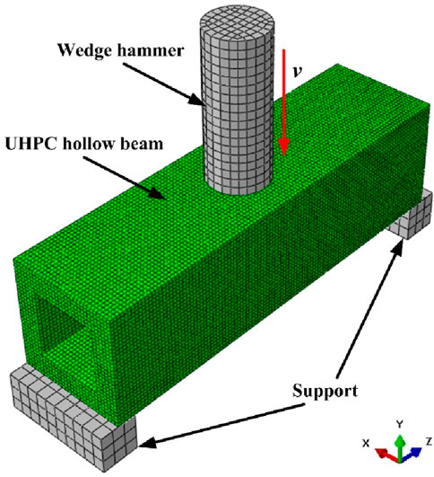 The dynamic response of the UHPC hollow beam under drop-weight impact loading was simulated using the finite element software ABAQUS, as illustrated in Figure 6. In the model, the X, Y, and Z-axes correspond to the width, height, and length directions of the UHPC hollow beam, respectively. The finite-element model consists of three components: the hammer, the UHPC hollow beam, and the support blocks. The support blocks and hammer were modeled as rigid bodies. The support blocks were assigned fully fixed boundary conditions. The hammer was given an initial velocity along the negative Y-axis. Hard contact (Hard Contact) with a friction coefficient of 0.2 was defined between the hammer, UHPC hollow beam, and support blocks. All components (hammer, UHPC hollow beam, and support blocks) were meshed using C3D8R hexahedral elements. The UHPC hollow beam was discretized with a mesh size of 5 mm, as further refinement did not significantly improve computational accuracy.