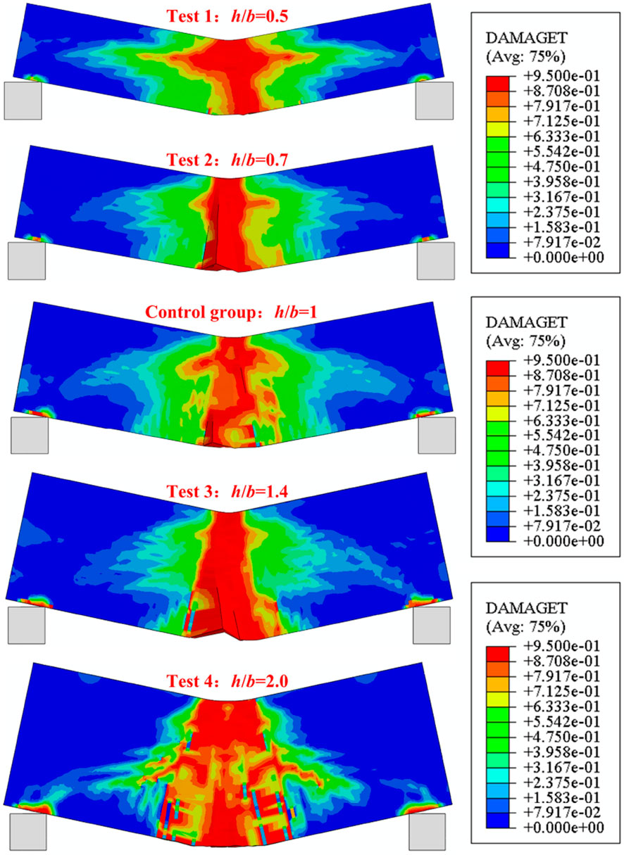 Figure 9 presents the final deformation modes of UHPC hollow beams with a drop hammer height of 1 m and th = tb = 30 mm under varying h/b ratios. The control group’s structural dimensions are specified in Section 2.1. It can be observed that the crack propagation in configurations with h/b = 0.7 and h/b = 1.4 is comparable to that of the control group, with the h/b = 0.7 case exhibiting the least crack propagation. When h/b = 0.5, cracks in the UHPC hollow beam propagate from the central cross-section along the height direction toward both sides under the loading center. For h/b = 2.0, catastrophic failure occurs at the mid-span of the beam. Excessively small h/b ratios increase fracture extent along the length direction, while overly large h/b ratios aggravate structural damage.
