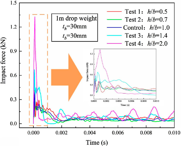 A quantitative analysis of the impact force–time histories for UHPC hollow beams with different h/b ratios is shown in Figure 10. The control group exhibits an impact force peak of 0.51 kN. The UHPC hollow beam with h/b = 2.0 achieves the highest impact force peak of 1.33 kN, representing a 61.7% increase compared to that of the control group. In contrast, the h/b = 0.7 configuration shows the lowest peak of 0.45 kN, 11.8% lower than that of the control group. The beam with h/b = 1.4 demonstrates stable load-bearing capacity after the initial peak force phase but loses load-bearing capacity after 0.0006 s, with a peak impact force (0.57 kN) close to that of the control group.