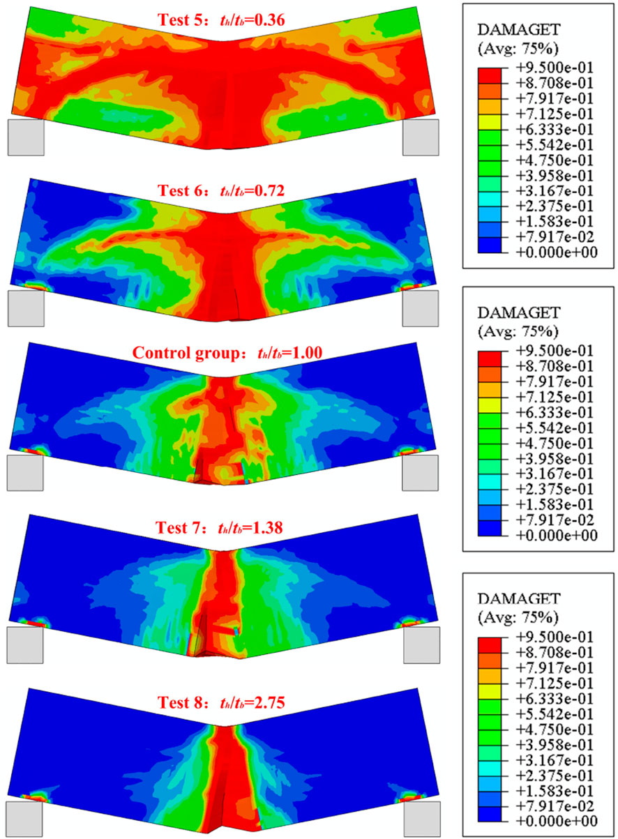 Figure 11 illustrates the final deformation modes of UHPC hollow beams under different th/tb ratios. When th/tb < 1, the structure exhibits a higher fracture extent, with structural damage intensifying as th/tb decreases. The configuration with th/tb = 0.36 undergoes complete fracture and catastrophic failure. In contrast, UHPC hollow beams with th/tb > 1 experience less severe damage, achieving minimal deformation at th/tb = 2.75. Therefore, increasing the wall thickness along the height direction during structural design can enhance performance.