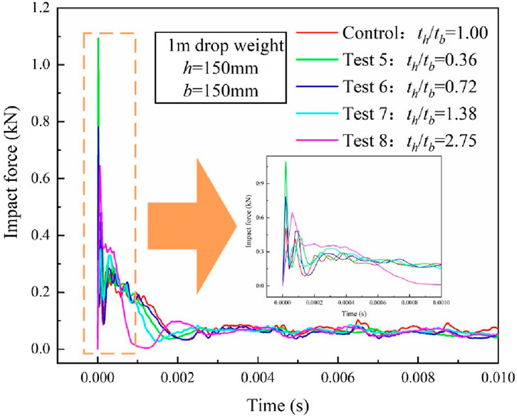 3. Effect of thickness ratio (th/tb): For a fixed h/b ratio, the peak impact load increased as th/tb decreased. The beam with th/tb = 0.36 experienced complete fracture and catastrophic failure, whereas the configuration with th/tb = 2.75 showed minimal deformation.