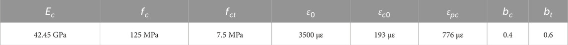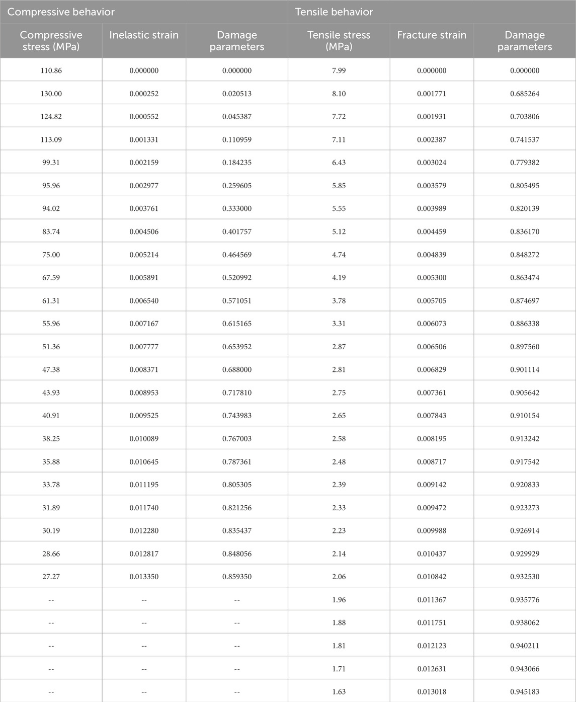 In the definition of the concrete damaged plasticity (CDP) material properties, it is also necessary to specify the following parameters: the dilation angle, eccentricity, the ratio of the second stress invariant under tensile to compressive loading (ensuring the maximum principal stress is negative), the ratio of the initial equiaxial compressive yield stress to the uniaxial compressive yield stress, and the viscosity parameter. Based on existing research findings, these five parameters are defined as 15°, 0.1, 1.16, 0.67, and 0, respectively (Al-Osta et al., 2017).