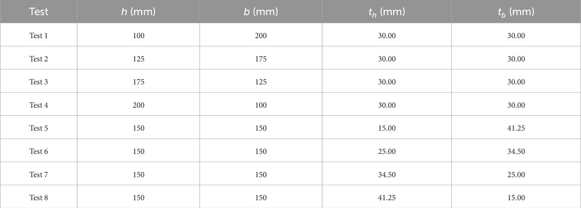 Under the loading condition of a drop hammer height of 1 m, this study investigates the influence of geometric parameters, including structural width, height, and thickness in both directions, on the impact resistance of UHPC hollow beams while maintaining a constant cross-sectional area. Table 3 summarizes the geometric parameters of different configurations, where h and b denote the height and width of the UHPC hollow beam, respectively, and th and tb represent the thickness along the height and width directions.