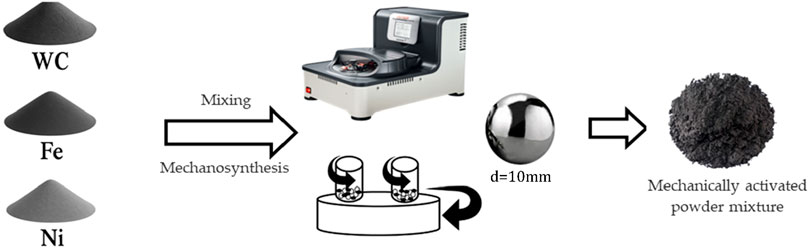 Prior to high-energy milling, accurately weighed WC, Fe, and Ni powders were charged into stainless-steel grinding bowls with stainless-steel balls and premixed for 20 min at 200 rpm to promote initial homogeneity. For mechanosynthesis, ∼9 g of the premix was loaded into a 45 mL stainless-steel vial with 10 mm stainless-steel balls at a ball-to-powder mass ratio (BPR) of 10:1 inside an argon-filled glovebox (VGB-3C) to prevent oxidation. The vial was hermetically sealed and mounted on a planetary micro mill (Pulverisette 7 premium line, Fritsch GmbH, Germany). Milling was conducted at 500 rpm. This speed was selected, based on literature guidance, as optimal for efficient mechanical alloying without excessive cold welding or ignition; it provides a high-energy impact regime suitable for particle fragmentation and alloying while keeping the temperature within a safe range.