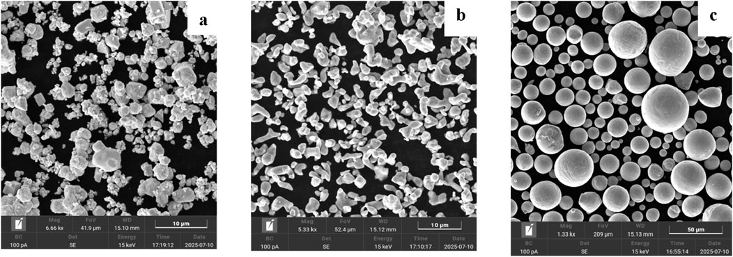 To provide a complete picture of the morphological transformations occurring during mechanosynthesis, Figure 8 presents SEM images of the initial WC, Fe, and Ni powders prior to mechanical activation. These images highlight the distinctive morphology and particle size distribution of each component. WC particles (Figure 5a) appear as irregular agglomerates with faceted surfaces, while Fe particles (Figure 5b) exhibit elongated, fractured shapes typical for ductile deformation. In contrast, Ni powders (Figure 5c) are characterized by nearly perfect spherical morphology, indicating their atomized origin. These initial morphological features play a critical role in governing the subsequent fragmentation, cold welding, and dispersion behavior during high-energy milling.