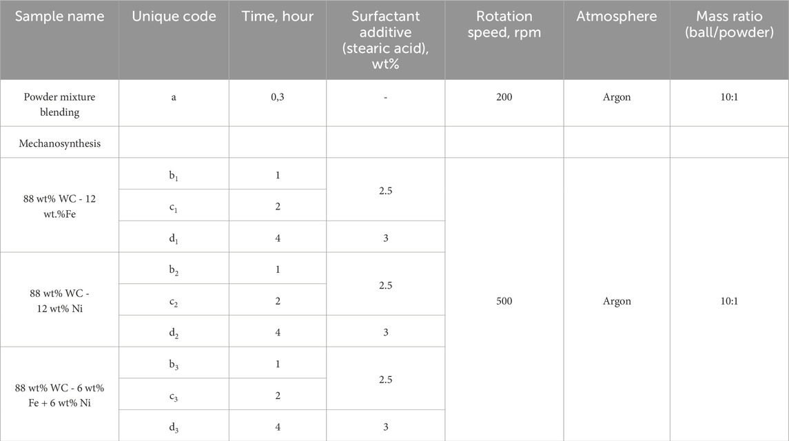 Three compositions with different binder chemistries were compared: WC-12 wt% Fe, WC-12 wt% Ni, and WC-6 wt% Fe + 6 wt% Ni. Each blend contained 88 wt% WC and a metallic binder phase. These specific compositions were selected to keep the total binder content constant at 12 wt% (typical for cemented carbides) while varying the binder chemistry. Such a binder level provides sufficient strength without a substantial decrease in hardness. Comparing Fe-only and Ni-only binders isolates their individual effects (Fe tends to form η-carbides, whereas Ni generally suppresses carbide formation), while the 6% Fe-6% Ni combination enables assessment of potential synergy in which Ni can mitigate Fe-related brittleness and Fe can enhance the strength associated with Ni. Each powder mixture was labeled and prepared under identical conditions. The mechanosynthesis conditions used in the experiments are given in Table 1.