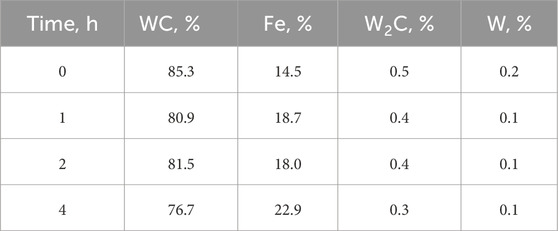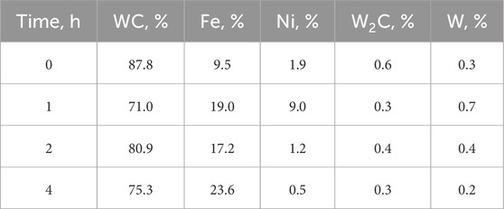 X-ray diffraction data in Figure 2 show the phase constitution of the WC–Fe sample subjected to mechanical alloying for 0, 1, 2, and 4 h. The identified phases are WC (PDF 98-001–5406), W2C (PDF 98-007–7567), W (PDF 98-004–1521), and Fe (PDF 98-063–1724). A gradual decrease in the fraction of crystalline WC is observed (from ∼85% to ∼76.7% of the total identified phases) accompanied by a corresponding increase in the apparent fraction of metallic Fe (from ∼14.5% to ∼22.9%) as milling time increases from 0 to 4 h (Table 2). At the initial stage (0 h), the diffractogram exhibits intense peaks characteristic of hexagonal WC, with dominant reflections from (001), (100), (101), (110), and (102), along with a small amount of α-Fe (bcc). Minor lines from W2C and W are present in all starting blends, which may originate from impurities in the as-received WC. Concurrently, the intensity of the Fe (110) reflection decreases and broadens, indicating that the ductile Fe binder becomes dispersed into nanometer-scale regions within the composite. The presence of W2C in the Fe-bonded sample points to partial decarburization of WC under intensive milling. This is attributed to the tendency of the iron binder to react with carbon from WC, leading to carbon deficiency in the carbide phase. The literature reports that Fe-bonded systems readily form η-phase carbides (of the M6C or M12C types, e.g., Fe3W3C) under carbon-deficient conditions; therefore, careful carbon balancing is required to avoid excessive η-phase in WC-based composites with an iron binder, as an excess can embrittle the material (Hoier et al., 2017).