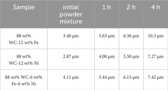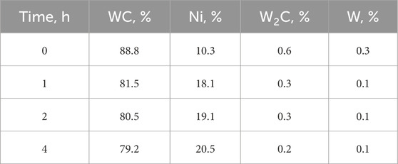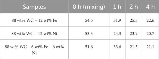 XRD patterns for the WC-FeNi composite (Figure 4) exhibit milling behavior that is in many respects intermediate between the Fe-only and Ni-only cases, yet with distinctive features arising from Fe–Ni interactions. The identified phases are WC (PDF 96-150–1519), W2C (PDF 98-007–7567), W (PDF 98-004–1521), Fe (PDF 98-063–1724), and Ni (PDF 98-004–3397). In the as-mixed state (0 h), WC, Fe, and Ni are resolved separately at ∼87.8 wt% WC, ∼9.5 wt% Fe, and ∼1.9 wt% Ni (Table 4). After 1 h of milling, the Fe and Ni peaks broaden and shift slightly. By 2 h, the amount of free Ni drops sharply (<2 wt%). After 4 h, individual Fe and Ni peaks are no longer clearly resolved; instead, a single broad feature appears near 44°–45° 2θ. This evolution suggests that Fe and Ni become highly intermixed or alloyed. Because Fe and Ni are mutually soluble, severe deformation during milling can promote formation of an Fe-Ni solid solution. Although room-temperature alloying is limited, the extensive defect population created by milling facilitates atomic mixing. The literature further indicates that adding Ni to Fe binders stabilizes the γ-austenitic Fe phase (Gibson et al., 2021). Notably, after 4 h only minor evidence of W2C is observed by XRD. No peaks of Fe3W3C carbides or Ni-rich η-type carbides are detected. The Fe-Ni combination thus appears to suppress the formation of discrete η phases during milling, consistent with reports that Fe-Ni binders remain relatively inert toward WC until sintering conditions are attained (Biedma et al., 2024).