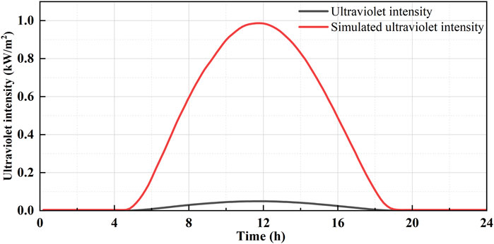 Figure 1. Ultraviolet intensity curve of Naqu on June 5 and simulated ultraviolet intensity curve. The graph shows the simulated solar shortwave radiation intensity (W/m2) used in the aging chamber over a 15-h cycle, which is set to 20 times the actual measured intensity from the Naqu region.