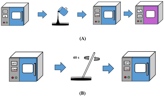 Figure 2. Ultraviolet aged asphalt preparation process. (A) Pouring the preheated asphalt into the aging pan. (B) Sampling the aged asphalt after heating and stirring for subsequent tests.