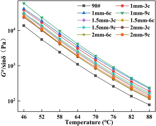 The SHRP program employs the rutting factor G*/sinδ from DSR testing as an evaluation criterion for the high-temperature performance of asphalt. Zhang (Zhang et al., 2018) research shows that A smaller amount of energy dissipated due to the viscous flow deformation of the material corresponds to a larger G*/sinδ value, indicating better rutting resistance for the asphalt material; conversely, a larger amount of dissipated energy reflects poorer rutting resistance. The temperature scanning test results for UV-aged asphalt are shown in Figure 3.
