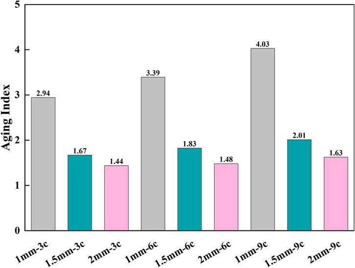 The results clearly demonstrate that film thickness is the dominant factor controlling the AI. As shown in Figure 4, thinner films consistently exhibit significantly higher AI, indicating a more severe degree of aging. For any given film thickness, the AI also increases with the number of aging cycles, although this effect is less pronounced than that of film thickness.