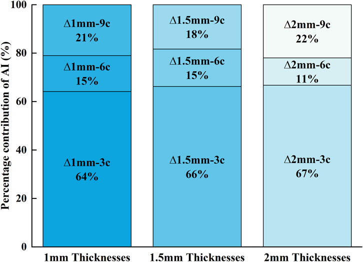 Figure 5. Shows the increment of aging index of UV-aged asphalt with different film thicknesses. The stacked bars illustrate the contribution to the total AI from three sequential aging periods: 0-3 cycles (ΔAI3C), 3-6 cycles (ΔAI6C), and 6-9 cycles (ΔAI9C).