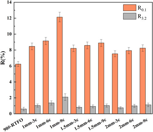 All UV-aged asphalts exhibit significantly higher R0.1 and R3.2 values compared to RTFO-aged asphalt. For example, the R0.1 value of 1 mm-9C is 12.14%, and the R3.2 value is 2.10%. This represents an increase of 94% and 250%, respectively, compared to the R0.1 and R3.2 values of RTFO asphalt, which are 6.24% and 0.60%. These results indicate that UV aging significantly enhances the elastic recovery capability of asphalt through photooxidative reactions. Under the same aging cycles, thinner films show higher R values, following the trend of “1 mm > 1.5 mm > 2 mm” Specifically, the R0.1 value for 1 mm asphalt after 9 cycles increased by 43.5% compared to that after 3 cycles, whereas the increase for 2 mm asphalt was only 9.4%. The 1 mm asphalt, due to its greater UV penetration depth, undergoes more uniform oxidation overall, resulting in an increased asphalt content that enhances its elastic recovery capability. In contrast, the 2 mm asphalt mainly experiences aging at the surface, with a portion of unoxidized components retained in the interior, limiting the increase in its recovery rate. As the film thickness decreases, the enhancing effect of aging cycles on the R value becomes more pronounced.