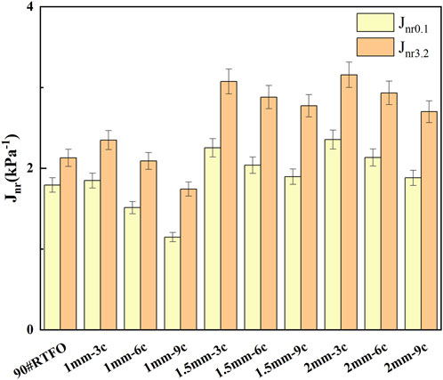It is noteworthy that the Jnr0.1 and Jnr3.2 values for the 1 mm-3C sample are slightly higher than the benchmark values for 90#-RTFO asphalt. The unrecoverable creep compliance for 90#-RTFO asphalt falls between the values of the 1 mm-3C and 1 mm-6C samples. Short-term UV aging may cause the volatilization of light components in asphalt, suggesting that the unrecoverable creep compliance of 90# asphalt can achieve equivalency under specific conditions between thermal oxidative short-term aging and UV aging.