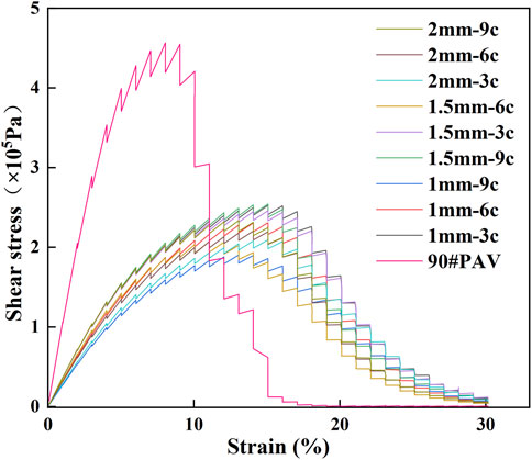 Figure 8 shows the stress-strain curves of asphalt under conditions where 1% strain is incrementally applied every 10 s, resulting in a total strain of 30% over 300 s at 3, 6, and 9 cycles. The curves indicate that both UV-aged asphalt and 90#-PAV asphalt exhibit a distinct inflection point. Beyond this point, as strain increases, the stress gradually decreases. According to the SHRP-A-367 report, asphalt binders exhibit increased brittleness and decreased strength once the stress-strain curve exceeds the ultimate strength. This behavior supports the observation that beyond the inflection point, the stress decreases due to micro-damage and reduced load-carrying capacity of the material (Petersen et al., 1994). This behavior is attributed to excessive shear stress, which causes damage to the asphalt at the inflection point. Consequently, subsequent increases in strain cannot maintain a high-stress state, leading to a rapid decline in stress levels. Under a strain of 30%, the UV-aged asphalt with thicknesses of 1 mm, 1.5 mm, and 2 mm, along with 90#-PAV asphalt, all fail.