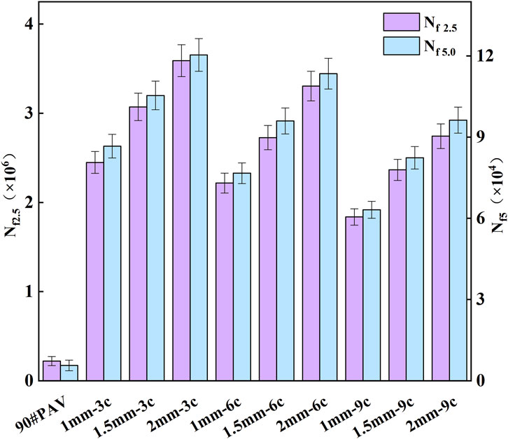 Under the conditions of 3 UV aging cycles, increasing the asphalt film thickness from 1 mm to 2 mm leads to a 46.6% increase in Nf2.5. After 9 UV aging cycles, Nf2.5 values for all film thicknesses decline, with the 2 mm asphalt showing a 23.6% decrease compared to the values after 3 cycles. As the aging progresses from 3 UV cycles to 9 UV cycles, the Nf2.5 values for 1 mm and 1.5 mm asphalt decrease by 25.0% and 23.0%, respectively, while the reduction for the 2 mm asphalt is 23.6%. This indicates that UV radiation, through molecular crosslinking and asphaltene enrichment, significantly increases the accumulation of fatigue damage. Wang (Wang et al., 2024b) states that oxidation leads to the loss of light components and the increase of heavy components in asphalt, which in turn leads to low-temperature cracking and reduced fatigue life.