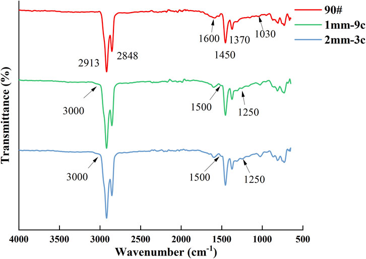 FTIR testing was conducted on asphalt samples with three different film thicknesses and three UV aging cycles, along with 90# asphalt. To analyze the UV aging mechanisms more clearly, the most representative 90# asphalt, the heavily UV-aged 1 mm-9C sample, and the lightly UV-aged 2 mm-3C sample were selected for functional group analysis. The spectra are shown below: