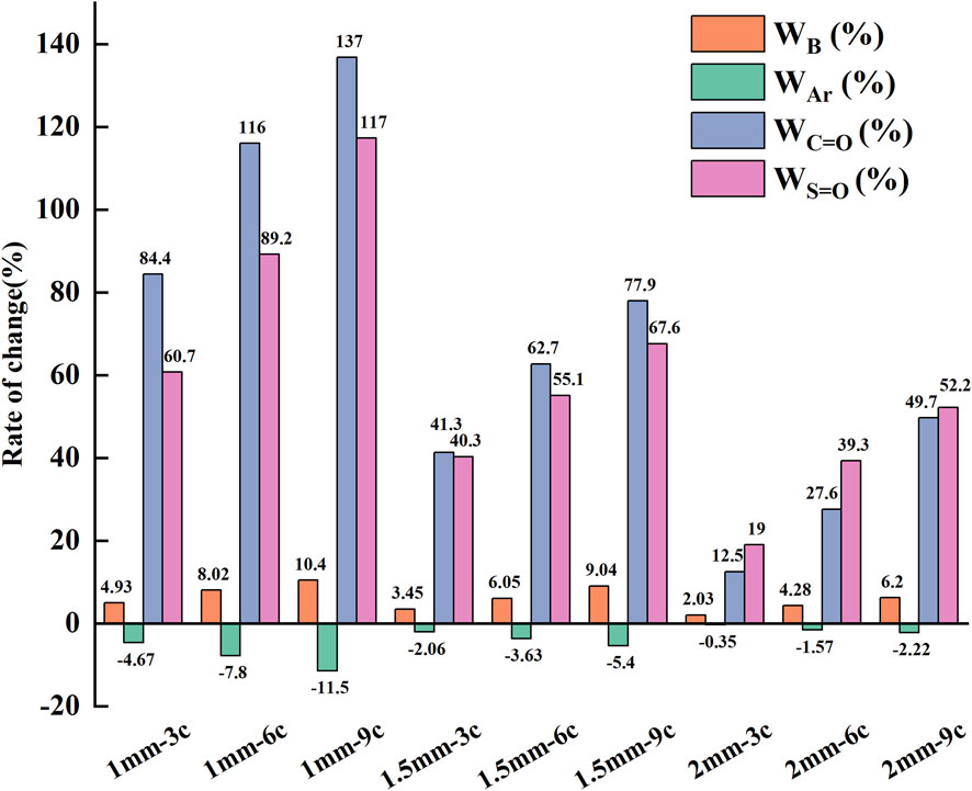In the UV aging of asphalt, aromatic compounds react to produce aliphatic hydrocarbons, alcohols, and a small amount of aliphatic carboxylic acids. For instance, an absorption peak appears at 970 cm-1 in Figure 10, primarily induced by the Norrish II cleavage mechanism, increasing IB. A comparison reveals that the values of WB, WC=O, and WS=O for the 1 mm-9C sample are the highest, while WAr is the lowest. Conversely, in the case of the 2 mm-3C sample, the situation is reversed. As the reaction progresses, aromatic functional groups produce a significant amount of highly aromatic hydrocarbons and colloids, while oxidation leads to the scission of side chains in polycyclic aromatic hydrocarbons, resulting in the formation of partially saturated alkanes.