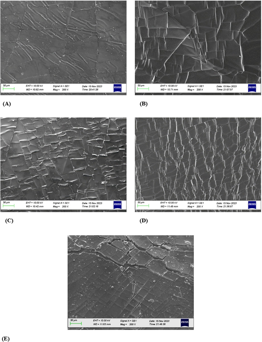 Figure 12. Shows the crack development process of UV-aged asphalt. The images, taken at 200x magnification, depict the progression of surface damage after (1), (3), (5), (7), and (9) UV aging cycles, from initial wrinkling to large crack formation. (A) 1 mm-1C (slight initial wrinkles on the surface). (B) 1 mm-3C (The wrinkles are deepened and the texture is more obvious). (C) 1 mm-5C (Microcracks begin to appear at the wrinkles). (D) 1 mm-7C (The wrinkles are interconnected to form a network-like crack system). (E) 1 mm-9C (The reticular cracks further developed into large-sized macroscopic cracks with fragmentation phenomenon, indicating that the material has been severely deteriorated).