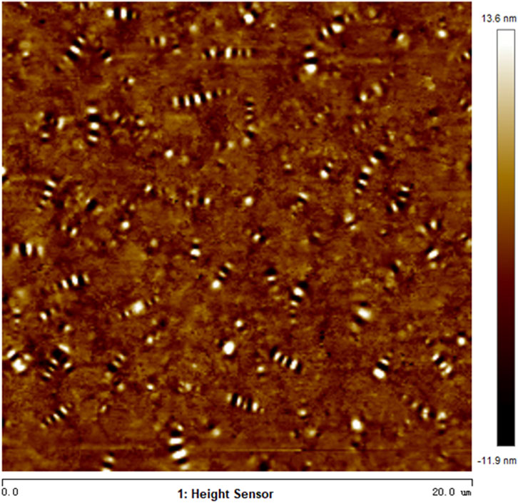 Figure 13. AFM scanning image of 90# asphalt. AFM topography of unaged 90# asphalt. The 20 μm × 20 µm scan shows the typical ‘bee structure’ morphology on the surface of the original asphalt sample.