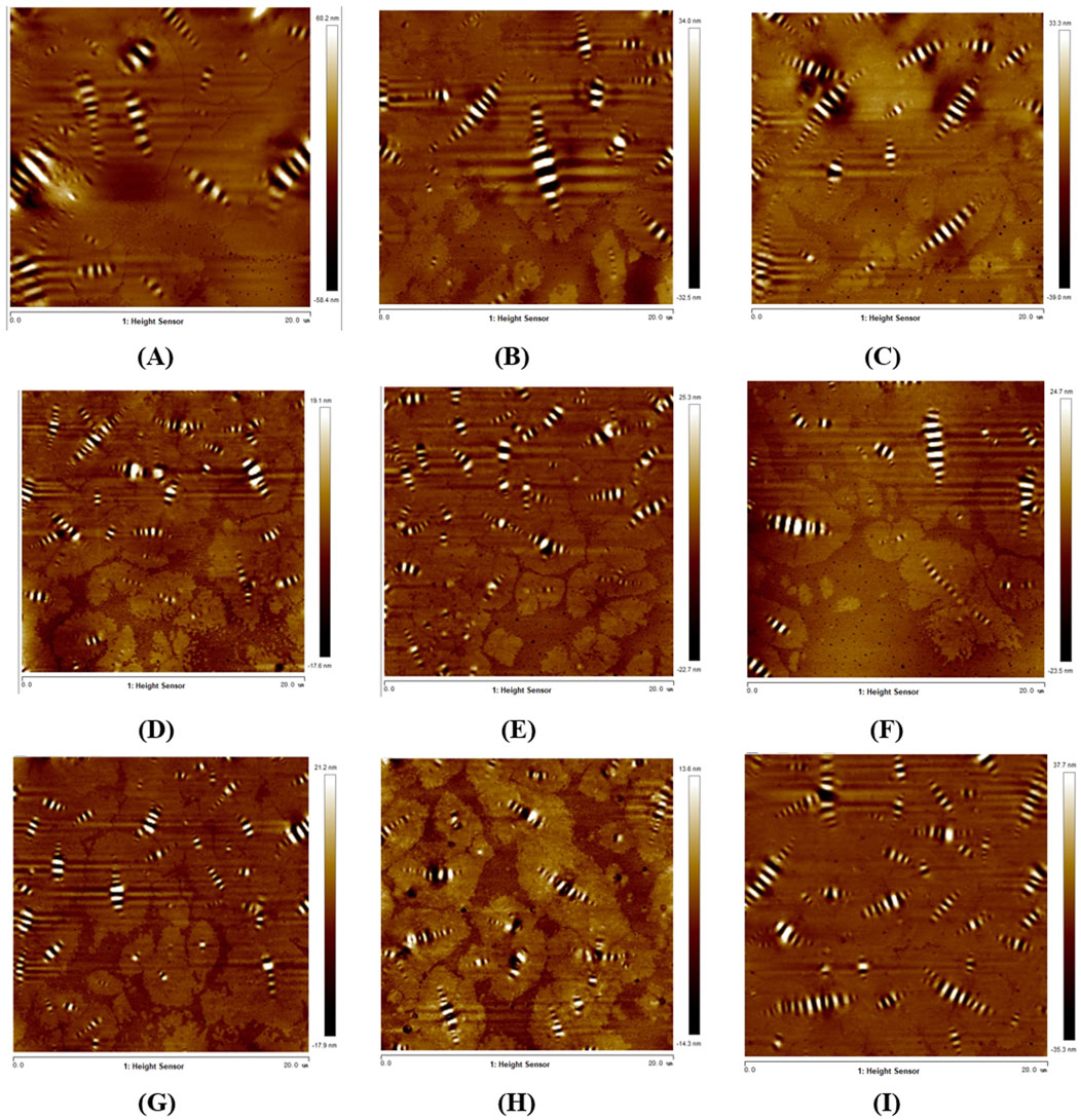 Figure 14. Microscopic morphology of UV-aged asphalt. Representative 20 μm × 20 µm AFM scans for asphalt with film thicknesses of (A) 1 mm, (B) 1.5 mm, and (C) 2 mm after 9 aging cycles. (A) AFM results for 1mm-3C. (B) AFM results for 1mm-6C. (C) AFM results for 1mm-9C. (D) AFM results for 1.5mm-3C. (E) AFM results for 1.5mm-6C. (F) AFM results for 1.5mm-9C. (G) AFM results for 2mm-3C. (H) AFM results for 2mm-3C. (I) AFM results for 2mm-9C.