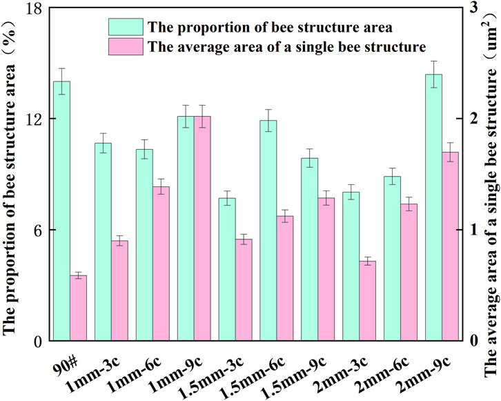 In the selected area, most UV-aged asphalt samples exhibit a smaller areal proportion of bee structures compared to 90# asphalt. Nevertheless, the areal proportion of these structures does not change significantly with variations in film thickness or aging cycles. This observation is attributed to the concurrent increase in the average size of individual ‘bee structures’ and a decrease in their quantity; these opposing effects result in a total areal proportion that does not show a clear trend with film thickness or aging cycles.