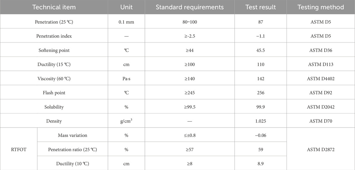 In high-altitude regions characterized by intense ultraviolet exposure, 90# asphalt and SBS-modified asphalt are commonly employed as binding materials. These materials possess a high content of saturated and aromatic compounds, which can dissipate UV energy through the conjugated structure of their molecular chains, thereby offering both UV brittleness resistance and low-temperature crack resistance (Zhou et al., 2024; Ren et al., 2025). However, to explore the effects of UV light on asphalt, it is important to note that SBS-modified asphalt requires the addition of 3%–5% polymer modifiers and other stabilizers during production, which complicates the consistency of the experimental samples’ performance. To eliminate extraneous interference, this study selects 90# asphalt produced by Panjin Dali Petrochemical Company, with its technical specifications listed in Table 1.