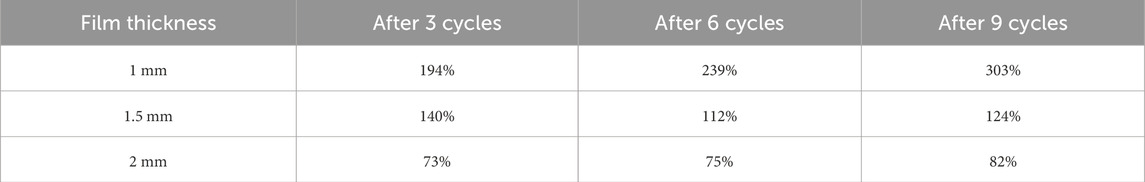 Consequently, as film thickness increases, the influence of additional aging cycles becomes progressively less significant. For the 2 mm thick film, the AI changes only slightly between 3 and 9 aging cycles. This suggests that the surface has reached an advanced state of aging, and further UV exposure has a diminished effect on the bulk properties of the thick sample.