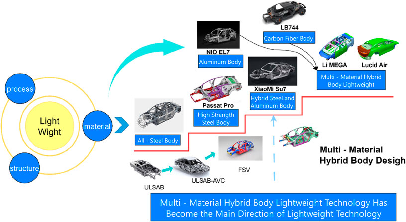 Carrier tools such as cars, aircraft, and rail transit vehicles are major sources of greenhouse gas emissions, and the task of energy conservation and emissions reduction has become increasingly urgent. In response, countries worldwide are enacting increasingly stringent emission regulations. For instance, the European Union’s Euro 6 standard aims to limit the average CO2 emissions from new passenger cars to no more than 60 g/km by 2030 (Järvikivi, 2021); the U.S. Environmental Protection Agency has established new standards for pollutants such as nitrogen oxides (NOx); and China has established a multi-dimensional policy framework to promote low-carbon industrial transformation, creating institutional synergies to achieve its “dual carbon” goals (Shen et al., 2025). Enhancing lightweighting levels is a key means of achieving energy conservation and emissions reduction in carrier tools, and the use of lightweight materials is an important pathway for promoting the lightweighting development of carrier tools (Anonymous, 2023; Weiqi et al., 2023; Yılmaz et al., 2017). Figure 1 shows the recent trends in the development of multi-material body structures. As shown in the figure, the use of lightweight metal materials combined with high-strength steel has become the mainstream material selection approach for vehicle body lightweighting. Among these, die-cast aluminum alloys, magnesium alloys, and titanium alloys—three types of low-ductility lightweight metal materials—are most widely used in combination with high-strength steel. However, the significant differences in physical properties, such as melting points, between high-strength steel and low-ductility lightweight metal materials pose challenges for traditional spot welding processes in achieving effective bonding, thereby introducing new concerns regarding the service performance of carrier tools.