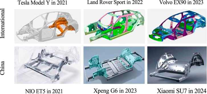 Die-cast aluminum alloys offer a moderate tensile strength, coupled with relatively low material costs, abundant raw materials, and high recyclability, making them widely used in industries such as automotive, aviation, and aerospace (Casarotto et al., 2012; Dong et al., 2025). For example, in 2021, the Tesla Model Y became the first vehicle to adopt large-scale one-piece die-cast aluminum alloy, significantly enhancing the vehicle’s lightweight design. Subsequently, Chinese automotive companies such as NIO, Xpeng, and Xiaomi began to develop die-casting technology and successively launched steel/die-cast aluminum alloy hybrid body products, driving the rapid development of die-cast aluminum alloy in vehicle bodies, as shown in Figure 2. In the aerospace field, die-cast aluminum alloys are primarily used in the structural components of spacecraft rocket fuel tanks, spacecraft fuselages, and large pressurized cabins of manned spacecraft (Li et al., 2023). However, die-cast aluminum alloys are prone to porosity defects and thermal cracking tendencies during production (Réger et al., 2023). For example, Cao et al. (2024) found that casting process parameters significantly influence the evolution of porosity defects, reducing material mechanical properties and sealing performance. Additionally, traditional die-cast aluminum alloys requiring heat treatment exhibit high welding defect rates due to internal gas pores, while non-heat-treated types show some improvement but still lag behind other materials in welding characteristics. In practical applications, vibrational environments can easily lead to connection issues (Pang et al., 2019), and such defects may exacerbate stress concentration and the risk of fatigue crack initiation (Chen et al., 2020). Furthermore, die-cast aluminum alloys have relatively low elongation, and during riveting processes, their surfaces are prone to developing “serrated” macro-cracks (as shown in Figure 3), which can impair the service characteristics of transport vehicles.