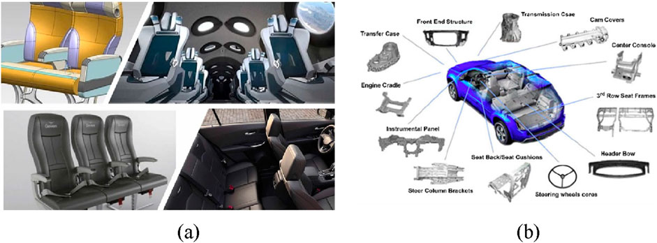 Figure 4. (a) Aircraft seats made of magnesium alloy (Yang et al., 2024) (b) Applications of magnesium-based materials in the automotive industry (Jovan and Seeram, 2021).