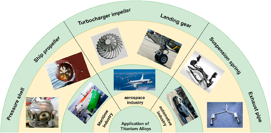 Titanium alloys, as lightweight high-strength materials, have a density ranging from 4.5 to 4.6 g/cm3, combining ultra-high tensile strength with excellent corrosion resistance, significantly reducing maintenance requirements, and are widely used in carrier tools. In the aerospace industry, it is used to manufacture aircraft engine blades, turbine disks (Peters et al., 2003; Singh et al., 2017), and other components. Titanium alloy landing gear components can reduce weight by approximately 15%–35% compared to steel components while withstanding significant impact (Singh et al., 2017); In the space industry, satellite mounts utilize its high strength and resistance to space environment corrosion to ensure long-term stable operation (Borba et al., 2018); in the marine industry, high-performance propellers are made of titanium alloy, effectively resisting seawater corrosion and improving propulsion efficiency (Ma et al., 2025). As shown in Figure 5, some applications of titanium alloy. However, the practical application of titanium alloys also faces the following challenges: Difficulty in connecting dissimilar materials. Chen et al. studied laser welding of titanium alloys with nickel-based Inconel 718 alloys, requiring precise control of heat input and laser deflection to suppress brittle phases and defects (Chen et al., 2011). Extremely high cost, which can be more than 10 times that of aluminum alloys, greatly limiting its large-scale application (Liu et al., 2020). Processing difficulties, requiring specialized equipment and complex processes. For example, manufacturing high-strength thin-walled titanium tubes necessitates special techniques such as the step-cooling spinning method developed by Xie et al. (2026). Recent research is addressing these challenges through surface modification (e.g., the dual-layer TiO2/PDMS superhydrophobic coating developed by Ma et al., which significantly enhances corrosion resistance to 99.88%) (Ma et al., 2025) and deep cryogenic treatment (e.g., Liu et al. demonstrated that it can refine grain size, increase dislocation density, and reduce stress corrosion sensitivity) (Liu et al., 2025). However, cost control and process simplification remain the primary factors limiting its broader application.