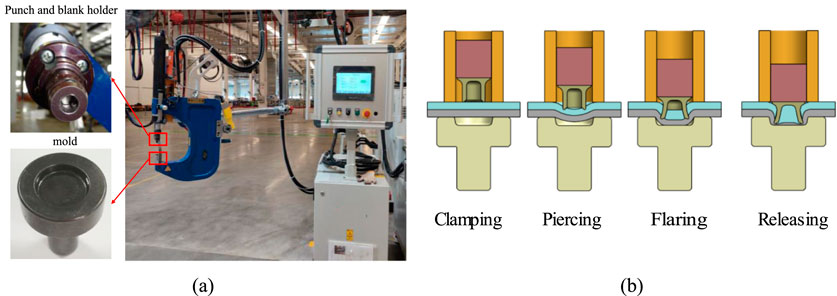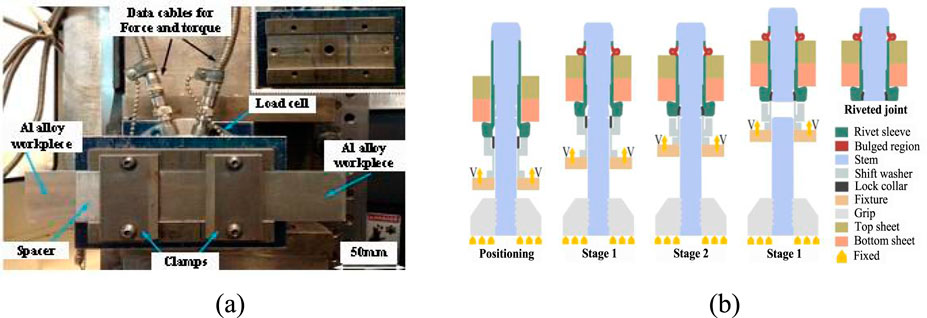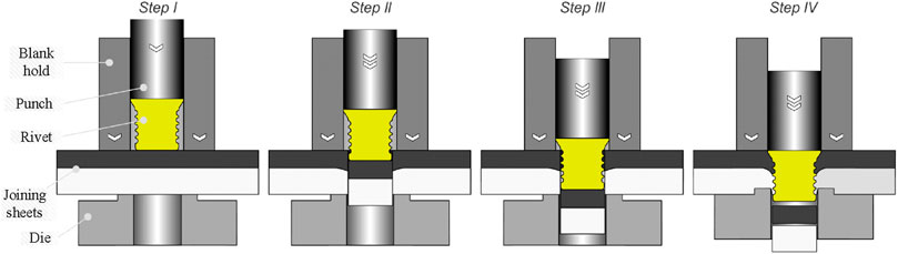 Self-piercing riveting (SPR) is an efficient cold joining technology, which is suitable for connecting dissimilar materials. As shown in Figure 8b, it is divided into four different steps: (1) Clamping, where two sheets are pressed against the die by a blank holder; (2) Piercing, where the upper sheet is split into two parts by a semi-tubular rivet driven by the punch; (3) Flaring, where the rivet tail starts to spread into the lower sheet, causing interlocking deformation between the two sheets; (4) Release, where the punch retracts and releases (Du et al., 2021a).