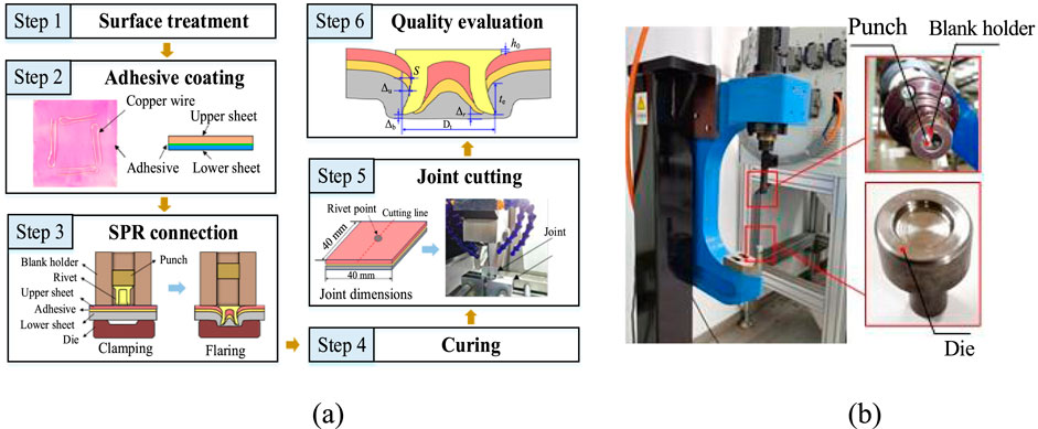 The adhesive-rivet hybrid joining process is an innovative riveting technology that combines adhesive bonding with mechanical riveting to fully leverage the advantages of both joining methods. As shown in Figure 10a, the process is as follows: (1) Surface treatment: remove oil stains on the base material, polish and clean debris on the material surface; (2) Applying adhesive layer: evenly apply the adhesive on the lower surface of the sheet; (3) Performing SPR connection: at this stage, the upper sheet and the adhesive layer are split into two parts by the semi-tubular rivet driven by the punch, and the rivet tail finally spreads into the lower sheet, causing interlocking deformation between the two sheets; (4) Curing: put all Riv-Bonding joints into an oven to cure the adhesive layer; (5) Cutting joints: all joints are cut along the center line of the rivet points; (6) Finally, quality evaluation is carried out (Du et al., 2025).