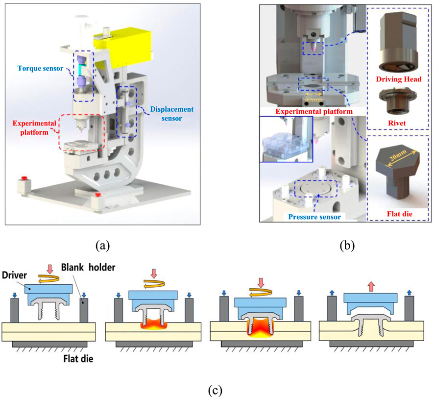 Figure 11. (a) Overall diagram of friction self-piercing riveting equipment (b) Details of the experimental platform and sensor acquisition module (c) Flow chart of friction self-piercing riveting process (Ma et al., 2017).