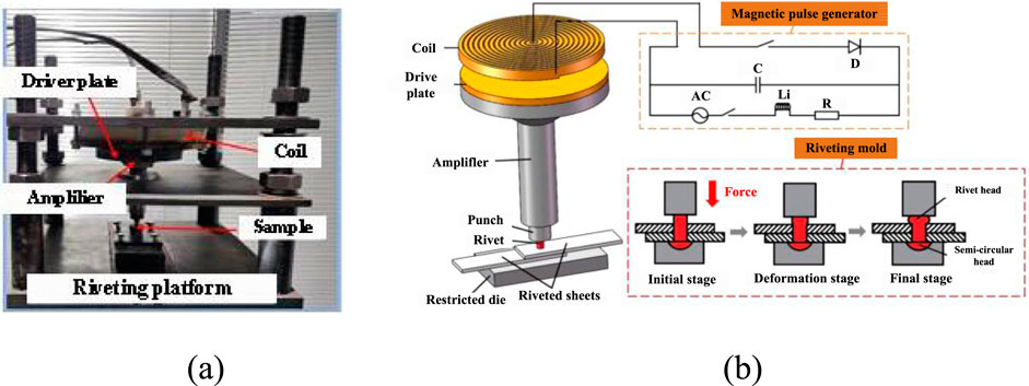 Electromagnetic Riveting (EMR) is an advanced process for material joining based on the principle of electromagnetic induction. It generates instantaneous impact force through the electromagnetic repulsion between the coil and the driver plate to plasticize the rivet, thereby completing the connection, as shown in Figure 12b. Its unique dynamic loading characteristics make it show significant advantages in the joining of low-ductility light alloy materials, and it has become one of the key technologies for the assembly of lightweight structures of carrier tools (Cao and Zuo, 2020).