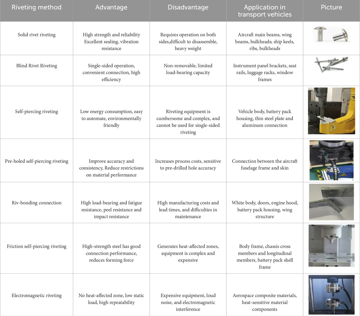 To overcome the inherent shortcomings of traditional spot welding processes in connecting high-strength steel and low-ductility lightweight alloy materials, riveting offers an ideal alternative solution. As a mechanical joining method, riveting eliminates the need for high-temperature processes involved in welding, thereby fundamentally avoiding issues such as heat-affected zone embrittlement, grain coarsening, and the formation of brittle intermetallic compounds. This enhances joint toughness and is particularly suitable for material combinations with significant differences in thermal-physical properties, such as aluminum/steel and aluminum/titanium (Heidrich et al., 2021; Kim et al., 2019). In recent years, riveting technology for lightweight alloy connections has seen significant development: Solid rivet riveting forms rigid connections through traditional forging processes, offering strong static load-bearing capacity and addressing reliability issues in high-strength applications for lightweight connections (Grimm and Drossel, 2019; Mucha, 2014; Vorderbrüggen et al., 2022); Core-pulling riveting enables single-side installation through its structural design, offering convenient operation and suitability for enclosed or narrow spaces, thereby improving connection efficiency in complex structures (Penalva et al., 2025; Tao et al., 2025; Tao et al., 2024); Self-piercing riveting (SPR) eliminates the need for pre-drilling holes, directly pressing into the sheet to form a lock, simplifying the process and enabling automation, thereby overcoming the efficiency bottleneck of traditional riveting requiring pre-drilling (Cacko, 2008; Danyo, 2014; Stephens, 2014; Zhao et al., 2022); Pre-holed self-piercing riveting guides deformation through precise pre-drilled holes, reducing resistance and enhancing adaptability to high-hardness, high-thickness materials, while lowering the risk of cracking associated with conventional self-piercing riveting (Liu et al., 2024; Wang et al., 2025c); Riv-bonding connection combine adhesive bonding with mechanical locking, enhancing overall performance through stress dispersion, offering excellent sealing and fatigue resistance, and addressing the performance shortcomings of single-mode connections (Gómez et al., 2007; Yang et al., 2025; Zhao et al., 2023); Friction self-piercing riveting (F-SPR) utilizes friction-generated heat to soften materials, simultaneously achieving stamping locking and interface bonding, making it suitable for connecting dissimilar materials and reducing brittle cracking during cold stamping (Ma et al., 2017; Xian et al., 2019). Electromagnetic riveting utilizes electromagnetic pulse force to drive rivets into high-speed forming, promoting plastic flow at high strain rates, resulting in superior forming quality and addressing the forming deficiencies of low-plasticity lightweight alloys (Cui et al., 2022; Jin et al., 2025; Jin et al., 2024). Table 1 below summarizes the connection methods for lightweight alloy materials. Different riveting technologies have distinct application scenarios and forming effects, so the appropriate method should be selected based on the properties of the connected components in practical applications.
