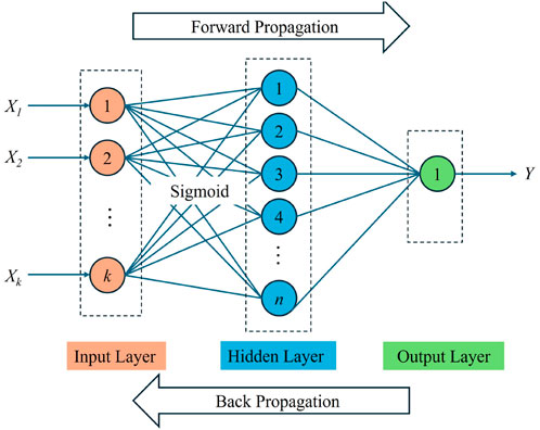 The development of artificial neural network models is based on the study of information processing in the human brain, by simulating the collaborative cooperation between neurons in the human brain during information processing to construct models. The ANN model is primarily composed of the input layer, the hidden layer, and the output layer, with neurons linking these three layers. The overall framework of ANN models is relatively easy to understand. After the model is constructed, various problems can be solved via a simple “input-output” process. However, in the process of model construction, it is necessary to reasonably determine the number of hidden layers and neurons based on the complexity of the problem. It is worth noting that for the research on HPC in this study, a single hidden layer can effectively predict the CS (Orbanić and Fajdiga, 2003). In addition, activation functions are also key components of ANN models. Most real-world problems are nonlinear problems, and activation functions introduce nonlinear relationships by establishing connections between the input and output of neurons, thereby equipping ANN models with the ability to handle nonlinear problems (Nguyen et al., 2020). For this study, the Sigmoid function serves as the model’s activation function. Figure 1 illustrates a typical single-hidden-layer neural network structure, where X1, X2, … , Xk are input parameters and Y is the output parameter.