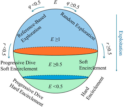 The HHO algorithm is a metaheuristic algorithm that optimizes model parameters by simulating the hunting behavior of Harris hawk swarms. It involves two key phases:a global exploration stage and a local exploitation stage (Heidari et al., 2019). This algorithm can automatically search for the optimal parameter combination within a preset parameter range, thereby overcoming the drawbacks of traditional parameter tuning methods (Moayedi et al., 2021; Song et al., 2021). The detailed optimization process for the HHO algorithm is depicted in Figure 2.