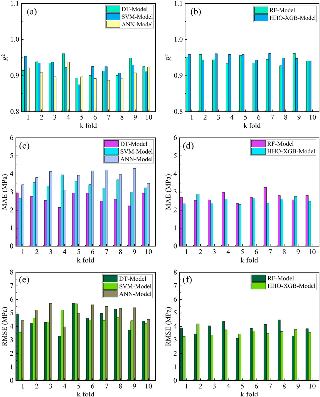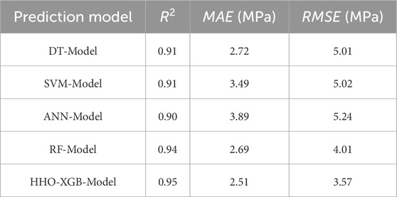 2. Compared with individual learners, ensemble learners adopting the Bagging and Boosting methods effectively improve prediction accuracy and stability. Specifically, compared to the best-performing individual learner (the DT model), its R2 increases from 0.91 to 0.94 (for the RF model) and 0.95 (for the HHO-XGB model), respectively; its MAE decreases from 2.72 MPa to 2.69 MPa (for the RF model) and 2.51 MPa (for the HHO-XGB model), respectively; and its RMSE decreases from 5.01 MPa to 4.01 MPa (for the RF model) and 3.57 MPa (for the HHO-XGB model), respectively.