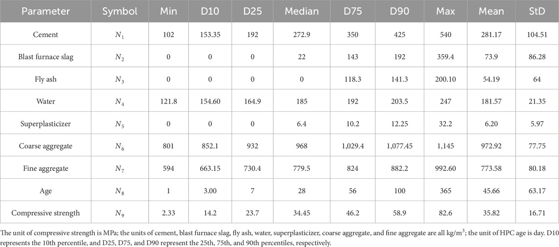 The CS data of HPC using industrial waste comes from the CS field of HPC in UC Irvine machine learning library (Lichman, 2013). The CS database of HPC comprises 1,030 data points, including CS, cement, fine aggregate, coarse aggregate, blast furnace slag, fly ash, water, superplasticizer, and HPC age. The quantitative statistical information of various parameters in the database is displayed in Table 1.