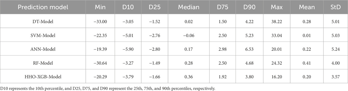 The prediction error of each learning model was analyzed and validated using the testing set, and the error distribution plot is shown in Figure 4. Table 3 also presents the error distribution statistics of the testing set for different models.