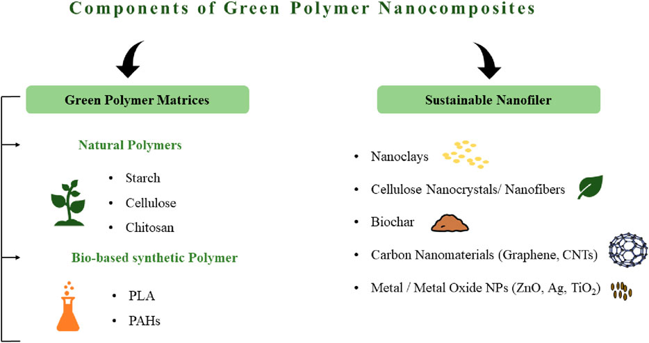 Green Polymer Nanocomposites (GPNCs) provide an important combination that enhances material’s functionality, innovation, and its environmental protective ability (Kausar, 2021b). Incorporating nanomaterials like cellulose nanocrystals, graphene oxide, or metal oxides into bio-based polymers allows GPNCs to outperform conventional biopolymers (Musa et al., 2025). These enhancements improve material characteristics such as mechanical durability, thermal stability, barrier resistance, and functional responsiveness, all while maintaining biodegradability (Zhang et al., 2019). For example, incorporation with nanofillers not only increases tensile stiffness and strength but also enhance toughness, stability, and resistance, thereby expanding the applications of sustainable polymers (Jagadeesh et al., 2021). Beyond structural reinforcement, GPNCs exhibit multi-functionality, setting them as promising materials for next-generation technologies (Losetty et al., 2025). Also it owns many advanced properties such as antimicrobial activity, photocatalytic activity, UV protection, and electrical conduction, GPNCs play an efficient role in smart packaging, biomedical devices and bioremediation (Singh et al., 2025). At the same time, GPNCs contribute in reducing environmental impacts through improving gas and vapor barrier properties copper (Peretz Damari et al., 2019; Alsoud et al., 2024), enhancing thermal degradation thresholds (Guan et al., 2018), and lowering energy processing hallmarks (Liu and Yabu, 2024). These collaborative enhancements spot GPNCs’ role in bridging high-performance material design with the urgent demand for eco-conscious industrial practices, signaling their pivotal role in advancing the circular bio-economy (Clement et al., 2025).