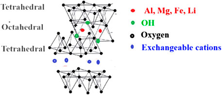 Nanoclays are powerful materials, layered aluminosilicates (Figure 2), that have been developed and utilized in numerous industrial applications (Undabeytia et al., 2021). They occur naturally in freshwater and can be synthesized. The tetrahedral silicate and octahedral aluminate arrangement allows for ion trapping, imparting unique mechanical, thermal, structural, barrier, and morphological properties (Jacquet et al., 2018).