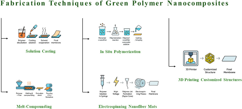 GPNCs are made from biodegradable materials like starch, cellulose, chitosan, alginatepolylactic acid (PLA), polyhydroxyalkanoates (PHAs), polybutylene succinate (PBS), and polycaprolactone (PCL). While eco-friendly, some may lack the strength for demanding applications. To enhance performance, nanofillers such as nanoclays, cellulose nanocrystals, biochar, carbon nanotubes, zinc oxide, titanium dioxide, and silver are added, improving strength along with gas barrier, antimicrobial, and photocatalytic properties (Mahajan et al., 2023; Harun-Ur-Rashid et al., 2023; Sunday et al., 2012; Saha, 2023; Bhawani et al., 2018). The high surface area and strong interfacial adhesion of nanoscale fillers enable significant property improvements at low loadings, allowing for reduced matrix use and the creation of lighter, high-performance polymer nanocomposites. Advanced processing techniques like solution casting, melt compounding, and 3D printing allow precise control over nanofiller mixing and properties for targeted applications (Iqbal et al., 2024). GPNCs are increasingly important in various industries. Starch or PLA-based nanocomposites with nanoclays strengthen packaging and improve moisture barriers. In automotive and aerospace, they create lightweight parts that reduce fuel use and emissions. In construction, GPNCs aid green building through coatings and insulation. They enhance filtration in water treatment and are biocompatible, making them suitable for tissue engineering, wound care, and drug delivery in biomedical applications (Avolio et al., 2018; Malucelli and Kausar, 2022; Reddy et al., 2013).